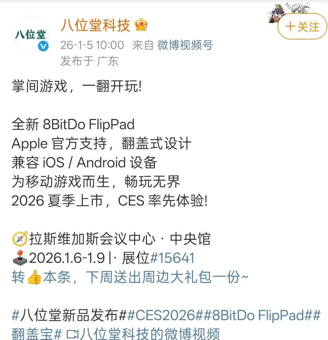 2026年1月5日,专注于游戏外设的创新型科技公司八位堂正式发布了专为安卓与iOS智能手机打造的竖屏游戏手柄FlipPad。这款产品将于CES 2026展会亮相,预计在2026年夏季正式上市。