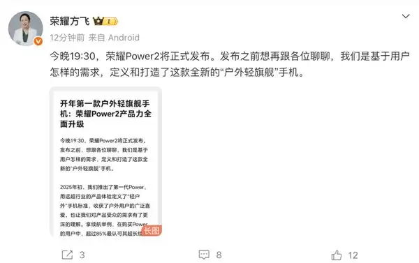 1月5日,晚19:30就到荣耀Power2新品发布会了,荣耀产品线总裁方飞今天发布微博为新品定调,自信展示了这款“户外轻旗舰”的顶格配置,其核心卖点直接瞄准了长期被市场忽视的户外工作者群体。