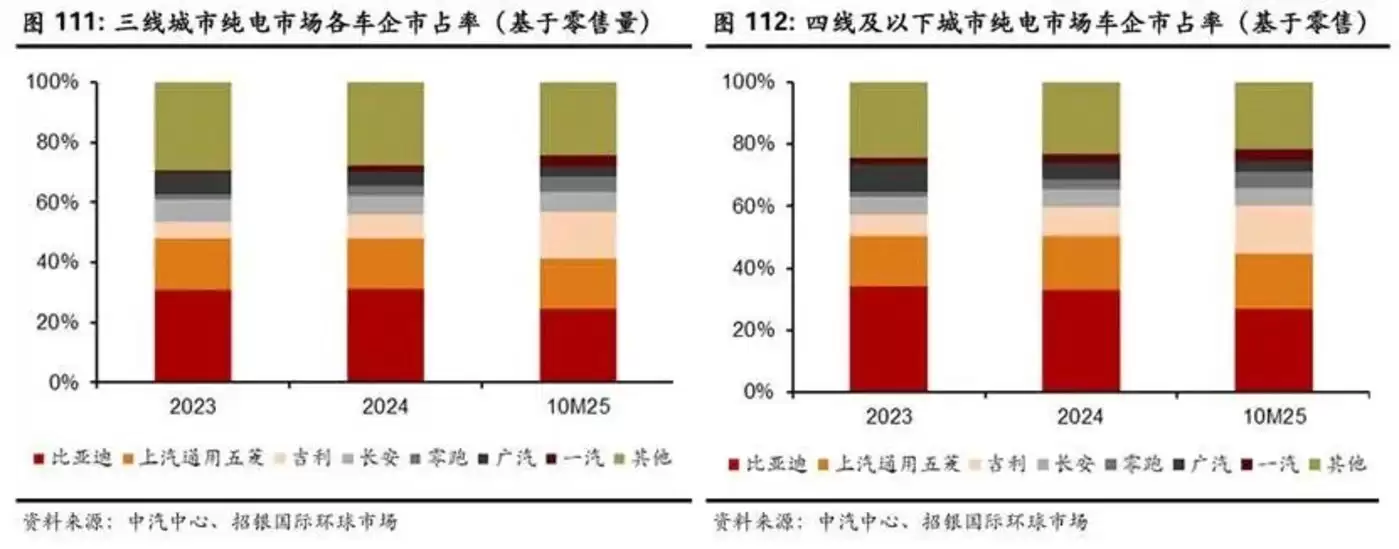 低线城市亦是如此,2025年前10个月,三线城市中比亚迪下滑8.2pct,吉利增长8.9pct,四线及以下市场比亚迪下降7.6pct,吉利增长6.7pct,基本都是同价位不同品的竞争置换。