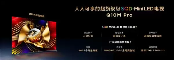 与此同时,人人可享的SQD-Mini LED旗舰级产品TCL Q10M也一并上市,同样搭载SQD-Mini LED技术,拥有碾压同价位产品的100% BT.2020全局高色域,配备最新的超级量子点技术。