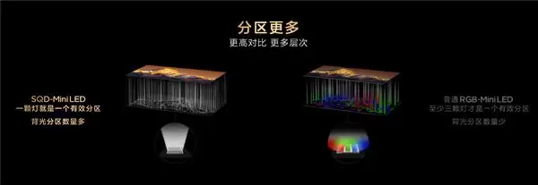 SQD-Mini LED单灯即为一个有效分区,而RGB-Mini LED需3颗灯组成一个分区,同等成本下Q10M Pro的物理分区数量是RGB-Mini LED 的3倍以上,控光精度大幅提升。