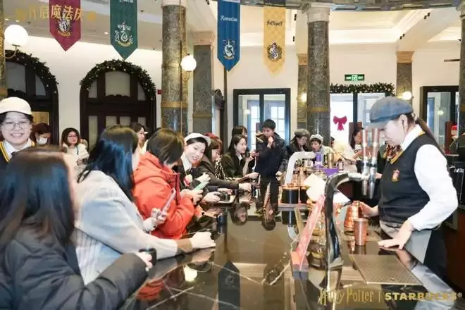 在星巴克门店里,如果你留心观察,或许会发现一些细节:这里的咖啡师(伙伴),是真的“入戏”了。他们不仅身穿魔法袍、手持魔杖,甚至在联名启动前就通过星巴克内部APP 开设的“我在星巴克学魔法”课程,模拟霍格沃茨魔法学校“入学—分院—上课—毕业”全流程,研读哈利·波特故事背景,学习联名饮品制作,像是真的入学了霍格沃茨一样。