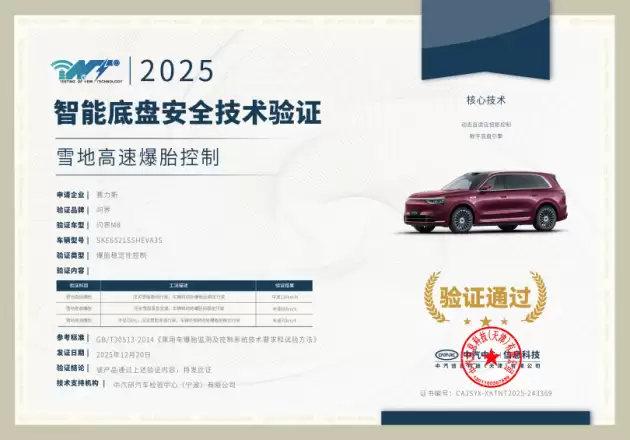支撑这些亮眼数据的,是问界M8搭载的华为途灵底盘与智慧四驱系统。该系统通过毫秒级响应的中央协同控制,实时调节驱动、制动、转向及悬挂参数,确保车辆在低附着力路面始终保持最佳姿态。在雪地高速爆胎测试中,即使以130km/h时速遭遇转向轮爆胎,车辆仍能保持直线行驶;紧急变道工况下,80km/h时速爆胎也可实现可控滑行;弯道测试中,70km/h时速下外侧转向轮突发爆胎仍能平稳通过。这些专项测试结果,为极端气候下的行车安全提供了重要技术参考。