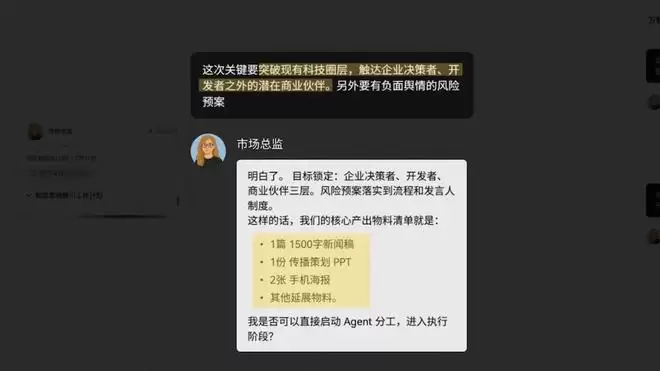 其一是“发布会策划”。用户仅需输入一句需求Prompt,系统即激活“市场总监”主智能体,负责拆解顶层任务目标,并快速规划出包含文案、视觉设计、媒介统筹等子任务的工作流。