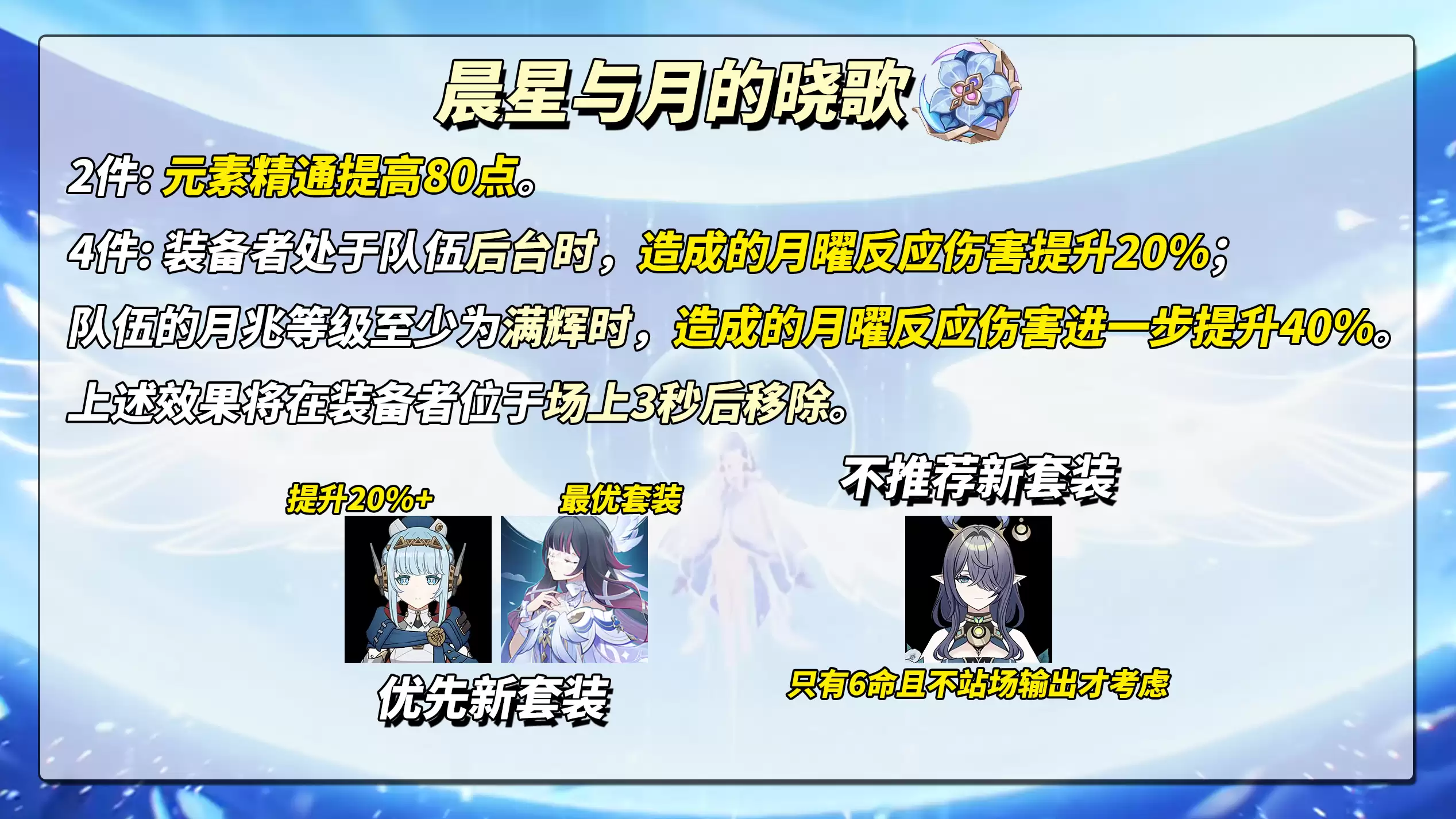 原神「晨星与月的晓歌」圣遗物究竟适合哪些角色使用呢?随着「月之四」版本新增两套圣遗物,分别对应魔导队伍与月曜体系,很可能会成为接下来整个罗特兰克地区的主流养成方向。接下来冻梨将为大家分析「晨星与月的晓歌」的套装效果,看看你手中是否有与之匹配的角色。