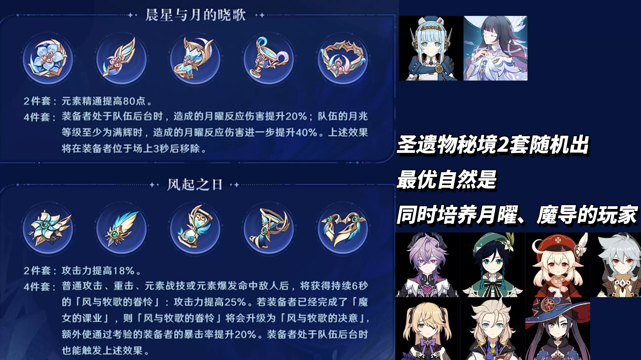 由于圣遗物秘境是两套套装随机产出,最理想的情况自然是同时培养月曜体系与魔导体系角色的玩家。目前这两套新圣遗物的强度表现都相当不错,如果你准备在后续版本继续抽取罗特兰克地区的新角色,可以提前筹备起来。反之,如果你当前没有,并且未来也不打算抽取月曜或魔导体系的角色,那么这个新秘境对你而言就暂时没有刷取的价值了。
