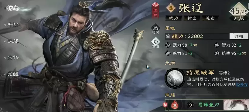 张辽在典型的物理数值中也同样具备高爆发效果,因此这两位武将才常被放在一起比较。当他们处于相同定位时,张辽同样能够实现连续打击的能力。在系统层面,张辽激活一次额外攻击时,能带来两次以上的伤害,输出方式非常简单直接。特别是在他一般攻击的情况下,通常会针对敌方的后排角色进行输出,所以张辽能带来的正面效果更高一些。短时间内要想拥有此类角色,他触发追击的条件会更简单一些。相较于马超后期强势提升的猛烈程度,张辽其实从前到后一直都非常稳定。