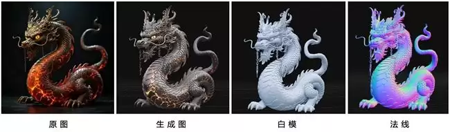 以龙形模型为例,其结构、纹理与材质呈现出高度协同性:整体盘绕姿态与体块关系清晰明确,鳞片、角、须等复杂细节严格依附几何结构生成,无任何拉伸或错位现象;即便处于灰模状态,仍能保持完整的体积感与层次感,生成后可直接对接打印与生产流程,无需额外修复。