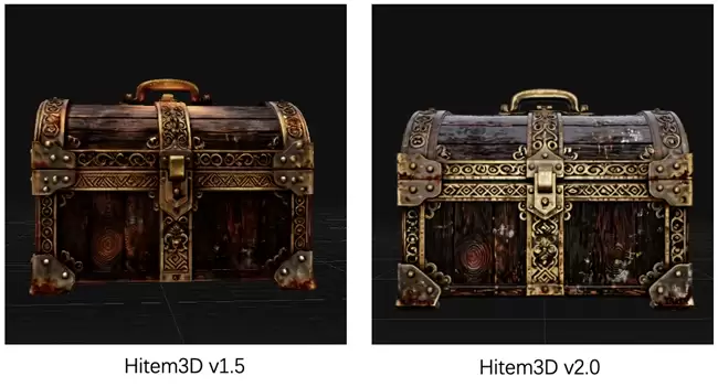 对比Hitem3Dv1.5版本,2.0在材质与结构关系的处理上更趋自然。以木箱模型为例,木板的年轮走向、拼接逻辑与箱体结构高度契合,表面磨损集中于边缘与底部,完美贴合真实使用场景下的损耗规律。2.0版本中的木材不仅呈现出清晰的板材逻辑,更蕴含着时间沉淀的质感,使木箱从单纯的“渲染物件”升级为接近真实可生产的三维资产。