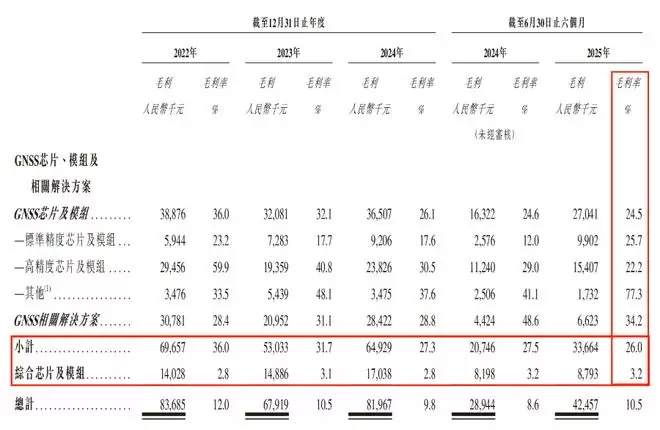 在业务构成上,数据显示,华大北斗约七成收入来自代理销售第三方芯片的“综合芯片及模组业务”,该业务毛利率长期徘徊在3%左右。高毛利(26%)的自研GNSS芯片业务收入占比仍然处于成长期,最新占比不过32.2%。