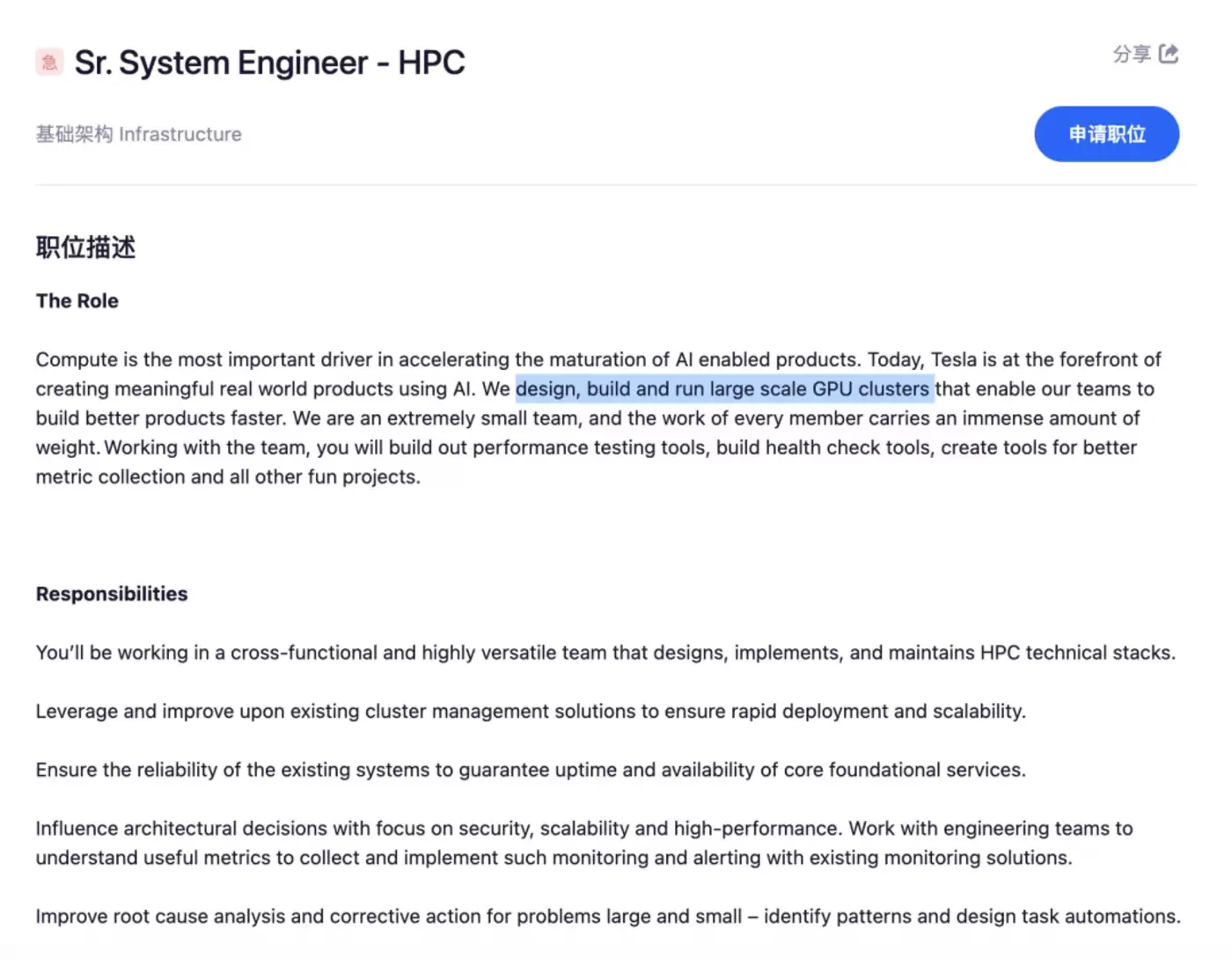 特斯拉中国突然刊登了一则“高级HPC系统工程师”的招聘启事。这个职位工作地点在上海,它的职责是要建设并维护下一代特斯拉数据中心。