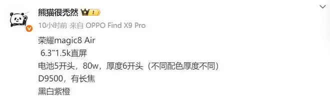据博主透露,荣耀Magic8 Air的核心配置已经很清晰,将会搭载联发科天玑9500处理器,采用台积电N3P工艺、全大核设计,性能表现很激进。