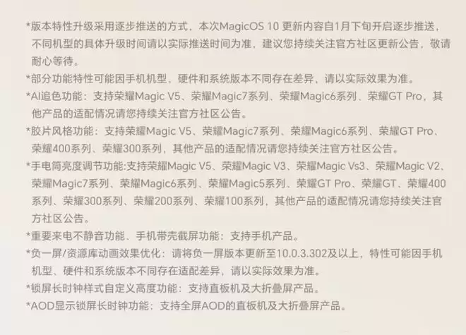 这项功能惠及的机型包括荣耀Magic V5、Magic7系列、Magic6系列、荣耀GT Pro,甚至下探到了荣耀400和300系列。