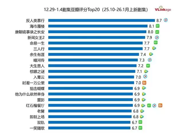 下图为2025年9月-2026年1月剧集在上周的豆瓣评分Top20。口碑最佳的作品依然是《反人类暴行》,《海市蜃楼》和《唐朝诡事录之长安》。《老舅》口碑持续滑落,上周跌至6.8分。