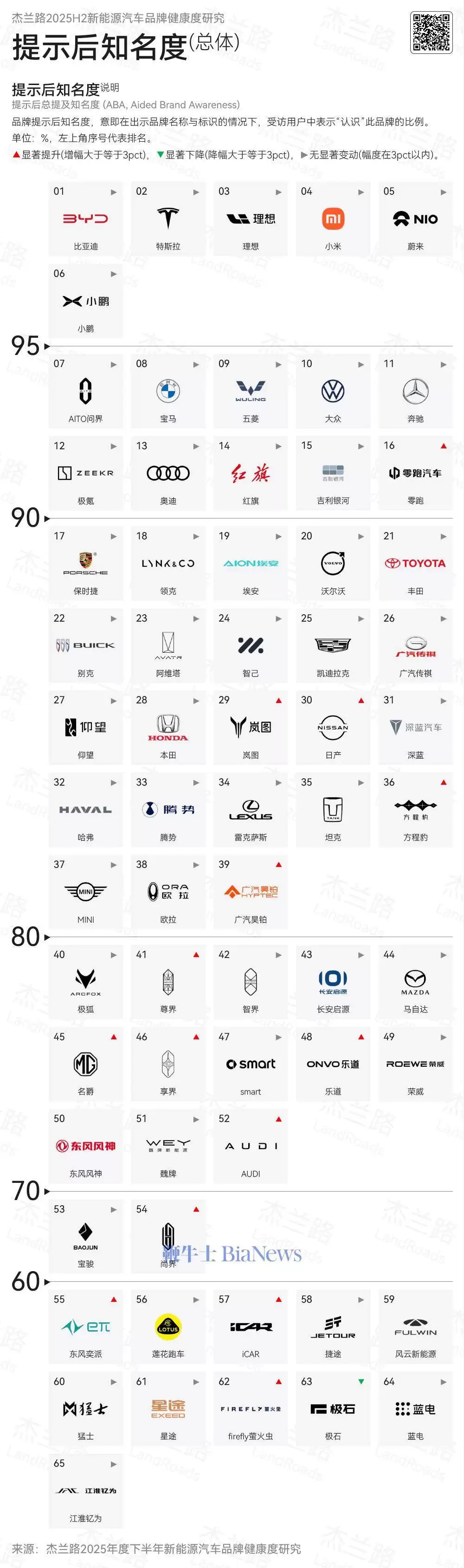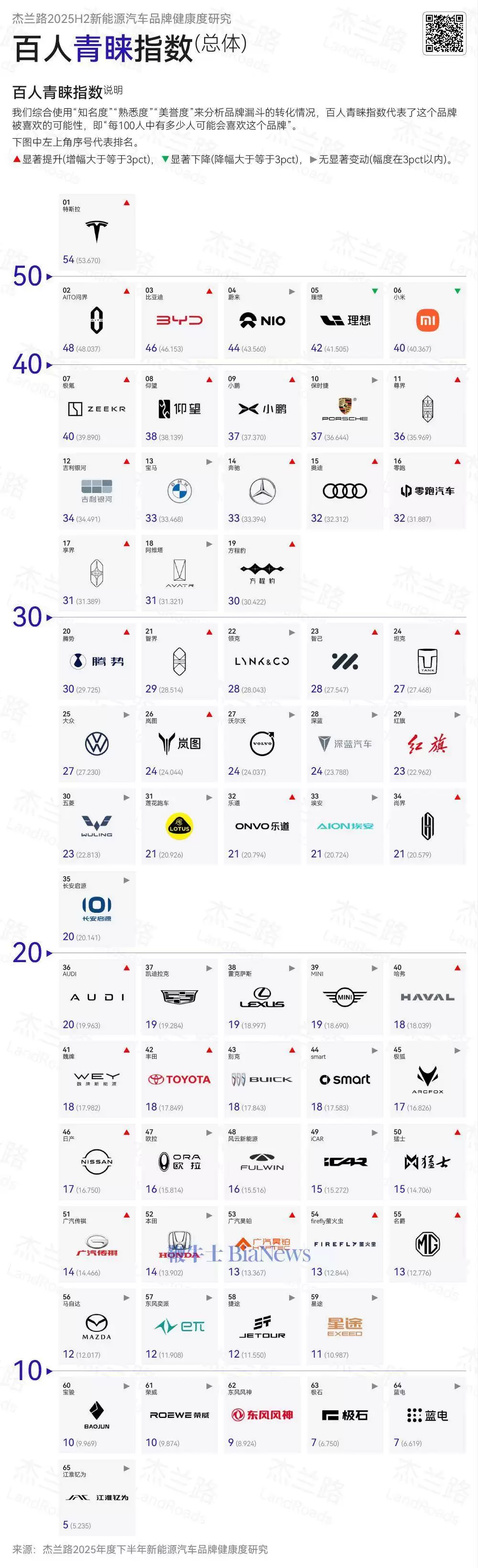 知名调研机构杰兰路近日发布了2025年度下半年新能源汽车品牌健康度研究报告。本次调研覆盖范围广泛,涵盖65个新能源汽车品牌,所有数据和观点均来自调研期间受访用户的直接反馈。