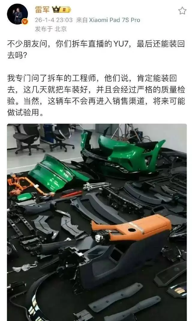日前,小米创始人雷军在社交平台就外界对小米YU7拆车直播的质疑作出回应。针对网友好奇被拆解的YU7能否重新组装回完整车辆的问题,雷军明确表示,他已向参与拆车的工程师团队确认,这辆车确实具备完全复原的条件。
