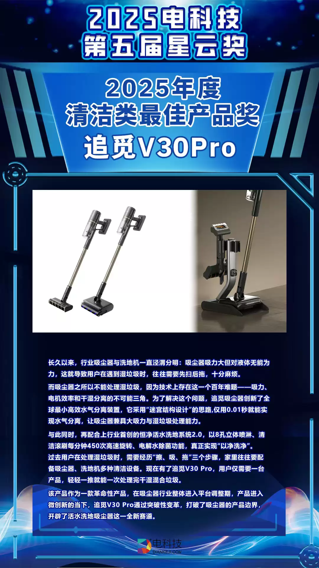 近日,电科技第五届(2025)星云奖评选结果正式揭晓。追觅V30 Pro活水洗地吸尘器凭借两大全球首创核心技术,以打破行业湿干分界线的革命性产品力脱颖而出,成功斩获“年度清洁类最佳产品奖”。这一权威荣誉,不仅是行业对追觅在吸尘器技术创新实力的高度认可,更是市场与广大用户对其重构清洁体验的直接肯定。