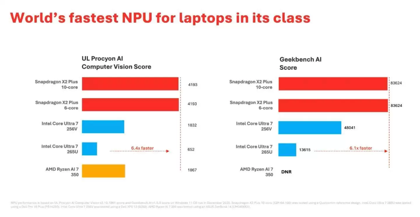 在AI任务方面,X2 Plus依然配备了与高端型号相同的80 TOPS神经网络处理单元。高通宣称,这使其成为“同级别笔记本电脑中全球最快的NPU”。
