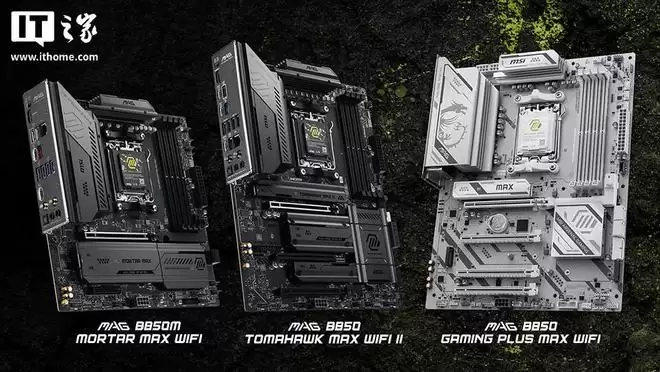 系列产品线包含三款核心型号:配置全面的 MAG B850 TOMAHAWK MAX WIFI II、主打性能的 microATX 规格 MAG B850M MORTAR MAX WIFI,以及全新推出的纯白配色 MAG B850 GAMING PLUS MAX WIFI。三款主板均在外观设计、扩展能力与整机适配性方面进行了全面升级。