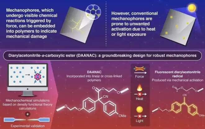 据悉,该材料采用一种全新设计的高可靠性机械敏感分子“二芳基乙炔-α-氰基肉桂酸酯(DAANAC)”作为核心骨架。其结构由具备稳定荧光特性的二芳基乙炔单元,与在结合状态下可淬灭荧光的氰氧基单元共同构成,二者通过相对较强的共价键连接。这种独特设计使DAANAC材料在面对热、光等环境应力时能保持高度稳定,同时又在受到机械力作用时能发生选择性断裂。
