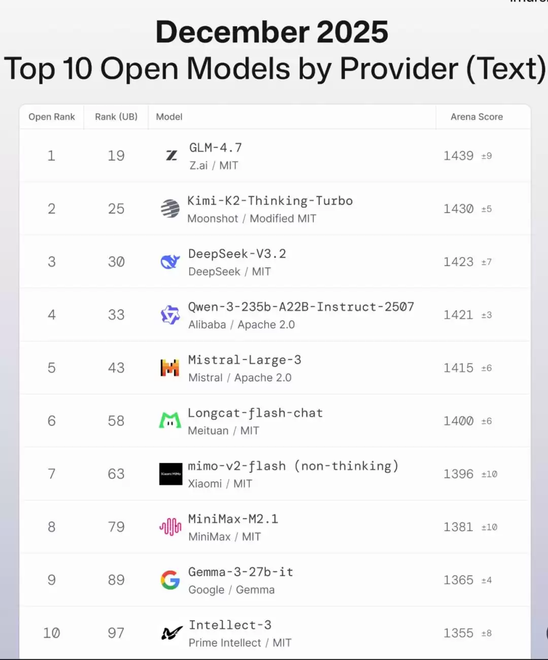这一年年终大考中。Lmarena.ai发布的2025年12月发布的开源大模型榜单显示,Kimi-K2-thinking超过DeepSeek v3.2问鼎第二。
