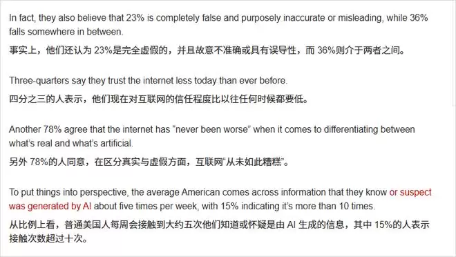 之前纽约时报在25年4月份,搞了个针对2000个美国人的问卷调查,说大多数人网络信任感直线下降,很大一部分原因就是AI生成内容太多,真假混杂,大家已经很难分辨自己眼前的东西到底是人写的,还是机器拼凑出来的。