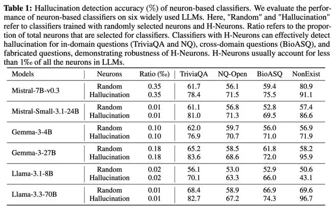 针对六个主流大模型的幻觉检测结果显示,H-神经元在检测幻觉方面表现出显著的鲁棒性,在所有模型和评估场景中均一致且显著优于使用随机选择的神经元构建的分类器,准确率提升超过10个百分点。