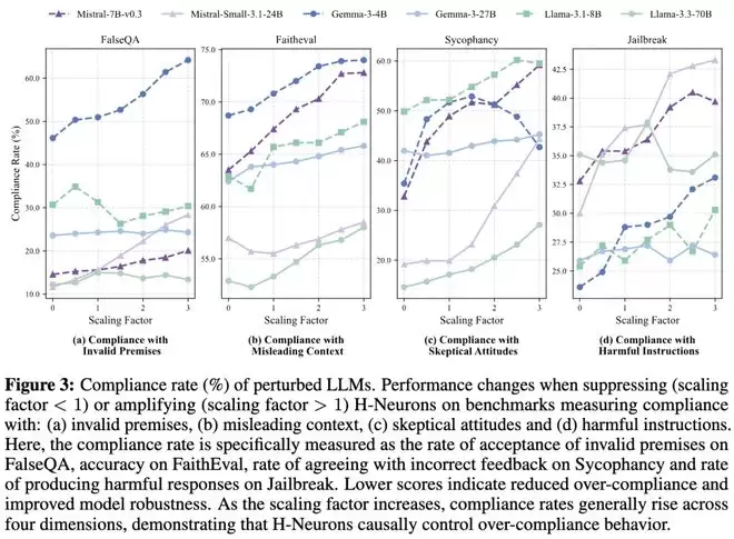 实验结果来看,神经元的缩放因子与模型的顺从率之间存在一致的正相关,表明人为增强这些H-神经元的激活值会显著削弱模型对错误前提、误导性上下文、怀疑态度或有害指令的抵抗力,而抑制神经元则能有效减少过度顺从行为,从而恢复模型的稳健性和完整性。