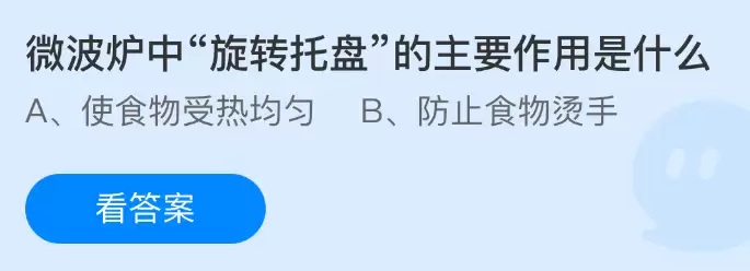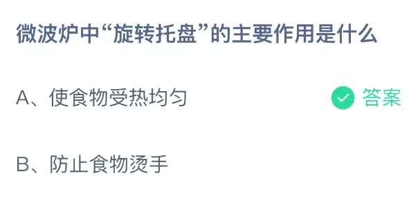 微波炉里的“旋转托盘”到底有什么用?一起探索支付宝蚂蚁庄园课堂的趣味问答吧!只需每天花上一分钟,答对题目就能免费领取饲料,喂养小鸡的同时还能为公益事业献出一份爱心,轻松又有意义!2026年1月6日蚂蚁庄园今日课堂的正确答案是【使食物受热均匀】,这也是微波炉中旋转托盘最主要的作用。