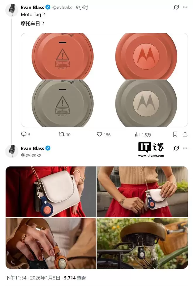 泄露图还展示了第二代智能追踪器 Moto Tag 2。这款产品延续了前代类似纽扣的设计,保留了对苹果 AirTag 配件的兼容性,并新增了鼠尾草绿和焦橙色两种配色可选。