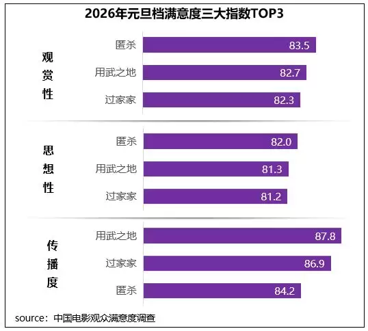 中国电影观众满意度调查・202 6年元旦档调查结果显示,元旦档电影观众满意度得分82.6分,档期观赏性、思想性和传播度分别为82.7分、81.2分和84.4分。档期 影片供给丰富多元,主调查的5部影片满意度都获得“满意”评价(满意度≥80分),其中 《用武之地》《匿杀》分别以83.3分、83.2分居前两位, 《过家家》82.9分居档期第三。