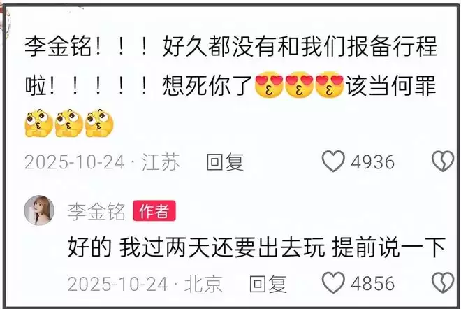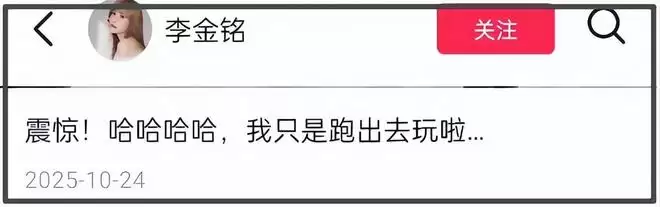 “失踪”传闻闹大后,李金铭在某平台发文回应称“我只是跑出去玩啦”,面对评论区粉丝的行程报备要求,她也只是敷衍回应说“过两天还要出去玩”,便没有再继续更新社媒了,对于停播,她也附和放松之说,还夸赞粉丝理智。