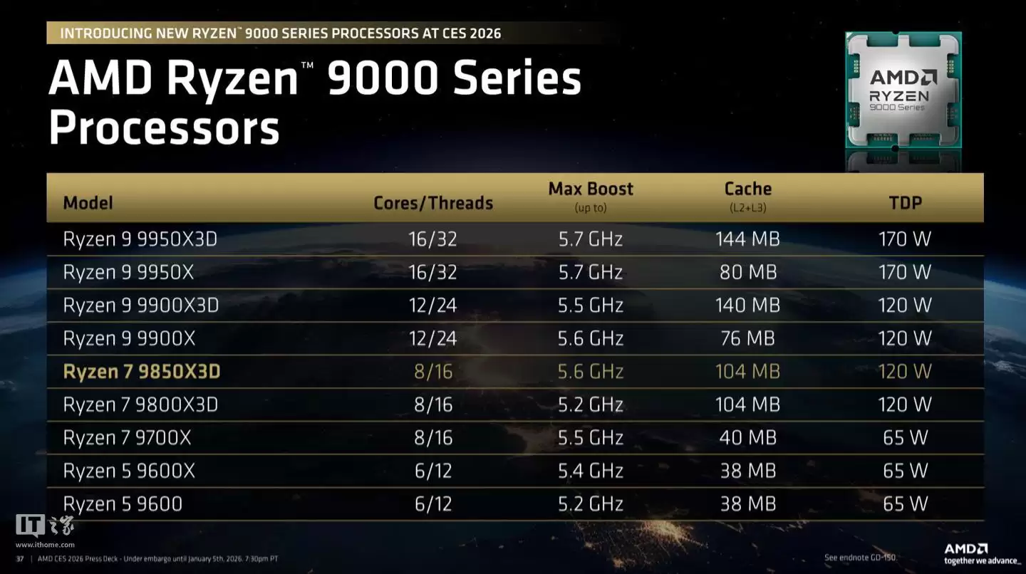 IT之家注意到,AMD尚未公布Ryzen 7 9850X3D的具体定价信息,但确认该芯片将于2026年第一季度正式上市。据外星人品牌透露,搭载这款处理器的Area-51台式机版本计划在2月率先推出。