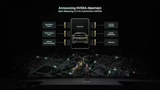 为了支撑这一野心,黄仁勋发布了英伟达自动驾驶开源 VLA(Vision-Language-Action, 视觉-语言-行动)模型 Alpamayo,宣称其是世界上第一个能思考、推理、自动驾驶车辆的开源 AI 系统。它可以视作英伟达在智驾技术路线全面转向 “端到端” 后推出的开源云端基座模型。