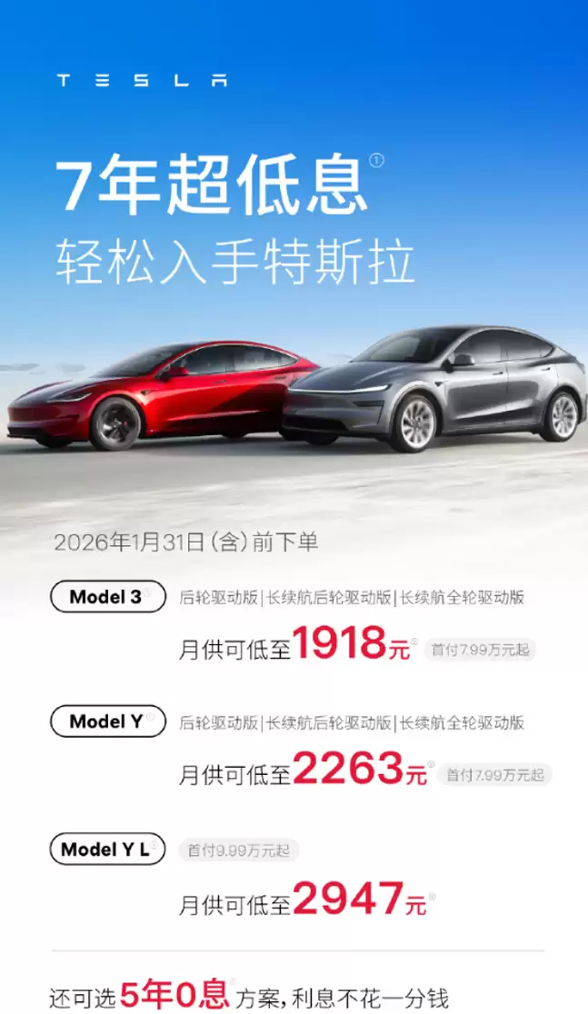 1月6日消息,根据特斯拉中国最新通告,自即日起购买Model 3、Model Y以及Model Y L车型的客户,将能够享受长达5年的零息金融方案。其中,Model 3与Model Y的首付门槛为7.99万元起,月供最低可至1918元;而Model Y L的首付则从9.99万元起,月供最低仅需2947元。