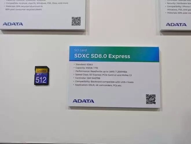 本次展台的焦点之一是旗舰级SDXC存储卡,该卡基于SD 8.0规格打造,通过引入PCIe Gen 3 x2通道与NVMe 1.3协议,实现了高达1.6 GB/s的顺序读取速度与1.2 GB/s的顺序写入速度。