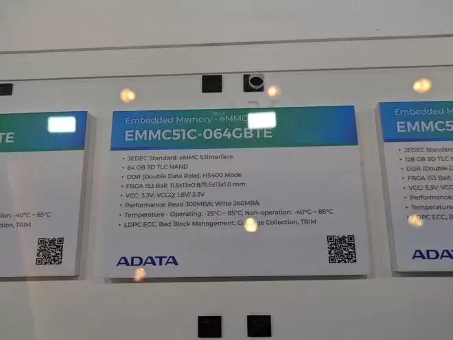 其内部包含32 GB的3D TLC NAND闪存与32 GB的LPDDR4X内存(HS400模式),存储部分提供190 MB/s的读取与115 MB/s的写入速度。同时展出的还有型号为EMMC51C-128GBTE的128 GB独立eMMC封装产品,读写速度分别达到300 MB/s和260 MB/s。