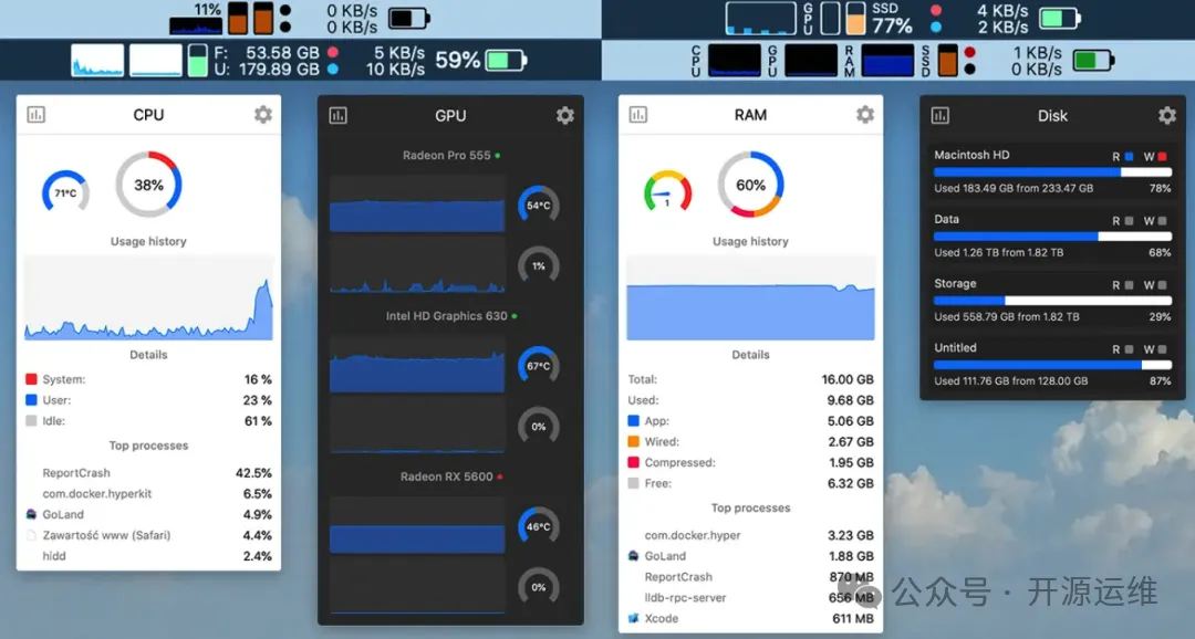 除了常见的 CPU 和内存,它还支持 GPU 负载、磁盘活动和传感器温度。电池模块能显示电量与健康状态。对于想深入了解设备细节的用户来说,这些信息很有价值。