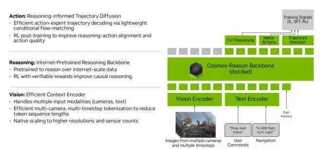 在底层,Alpamayo 1通过视觉与文本编码器处理来自多摄像头、多时间步的图像输入,同时融合导航信息、用户指令以及车辆自身的历史状态。该模块强调高效的上下文编码,通过对多模态信息进行压缩和结构化,控制序列长度和计算成本,为后续推理阶段预留足够的算力空间。