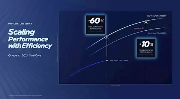 在性能提升上,Panther Lake在同功耗条件下的单核性能较前代Lunar Lake提升超过10%,多线程性能则因核心数倍增而大幅提升超过50%(上代Lunar Lake最多只有8个核心)。