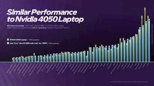 和竞品先比,Panther Lake在原生渲染方面比AMD的HX 370性能高出80%以上,即使加上图像放大功能,也能高出73%。与配备独立RTX 4050 显卡的笔记本电脑相比,Core Ultra X9 388H的集成显卡性能相近。