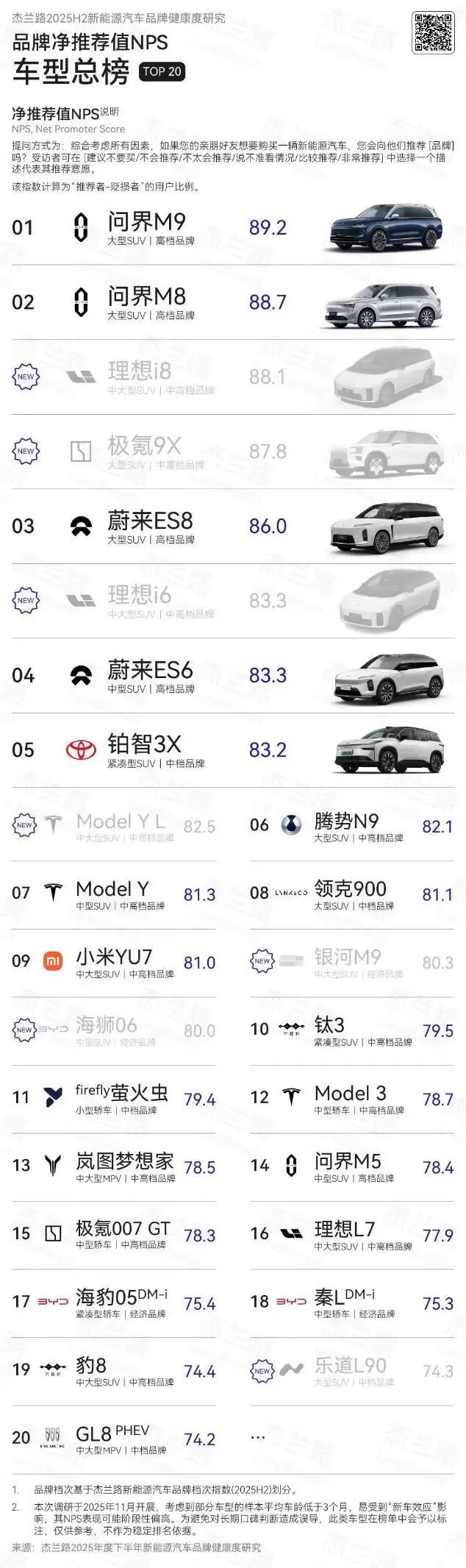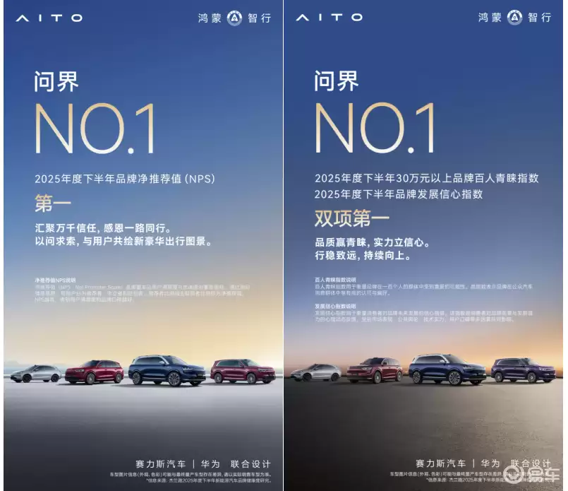 近日,杰兰路咨询发布的《2025下半年新能源汽车品牌健康研究报告》引发行业关注,问界品牌凭卓越表现成为焦点。该品牌不仅在品牌NPS(净推荐值)榜单中拔得头筹,还在品牌发展信心指数和30万元以上品牌百人青睐指数方面双双登顶,旗下两款旗舰车型也在车型NPS评选中斩获佳绩,充分彰显其在高端新能源赛道的领军实力。