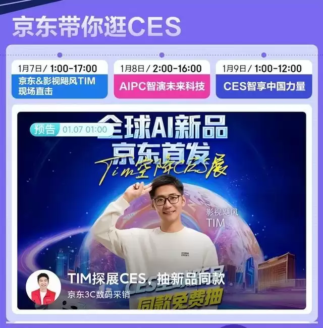 作为全球科技界的年度风向标,国际消费电子展(CES)一直是前沿科技与未来生活方式的集中展示舞台。2026年CES将于美西时间1月6日在美国拉斯维加斯盛大开幕。今年,京东3C数码采销团队不仅携手知名科技内容创作者“影视飓风Tim”带来连续三天、跨越时空的极限探展直播,更将为中国消费者开辟通往全球顶尖科技的“超级入口”,联合品牌合作伙伴带来多款重磅新品的独家首发、超前预约及惊喜拍卖活动,让国内科技爱好者能够第一时间体验全球最新科技成果。