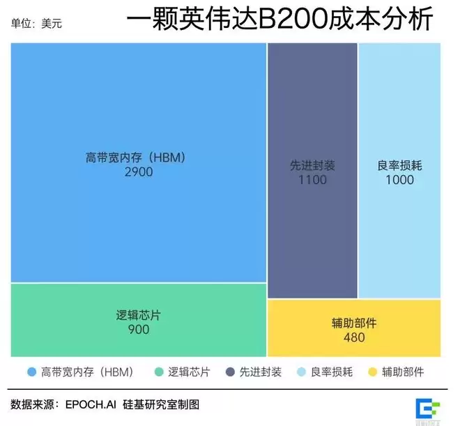 以一张英伟达B200显卡为例,最大头的成本来自HBM3E显存,成本在2800到3100美元,占了将近一半的成本,比GPU还贵。