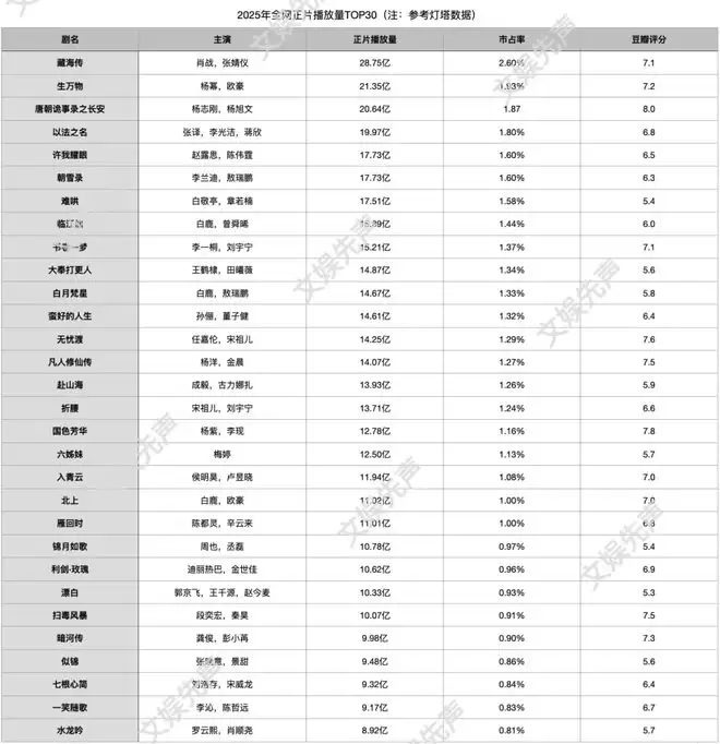 比如根据灯塔专业版2025年年榜显示,截至12月31日,全网正片播放量TOP30中,热播剧集豆瓣评分跨越8分的高分剧集仅有《唐朝诡事录之长安》,7分档位热播剧则有10部,5分、6分档位剧集则占据了热播剧市场大盘共计19部。