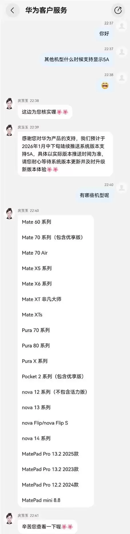 详细名单也很清晰,比如本月OTA 5A的具体机型包括Mate 60系列、Mate 70系列(含优享版)、Mate 70 Air、Mate X5系列、Mate X6系列。