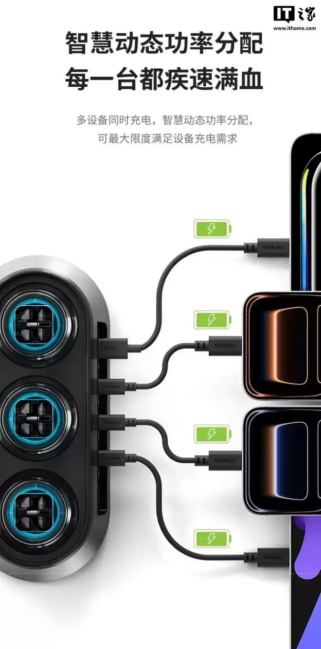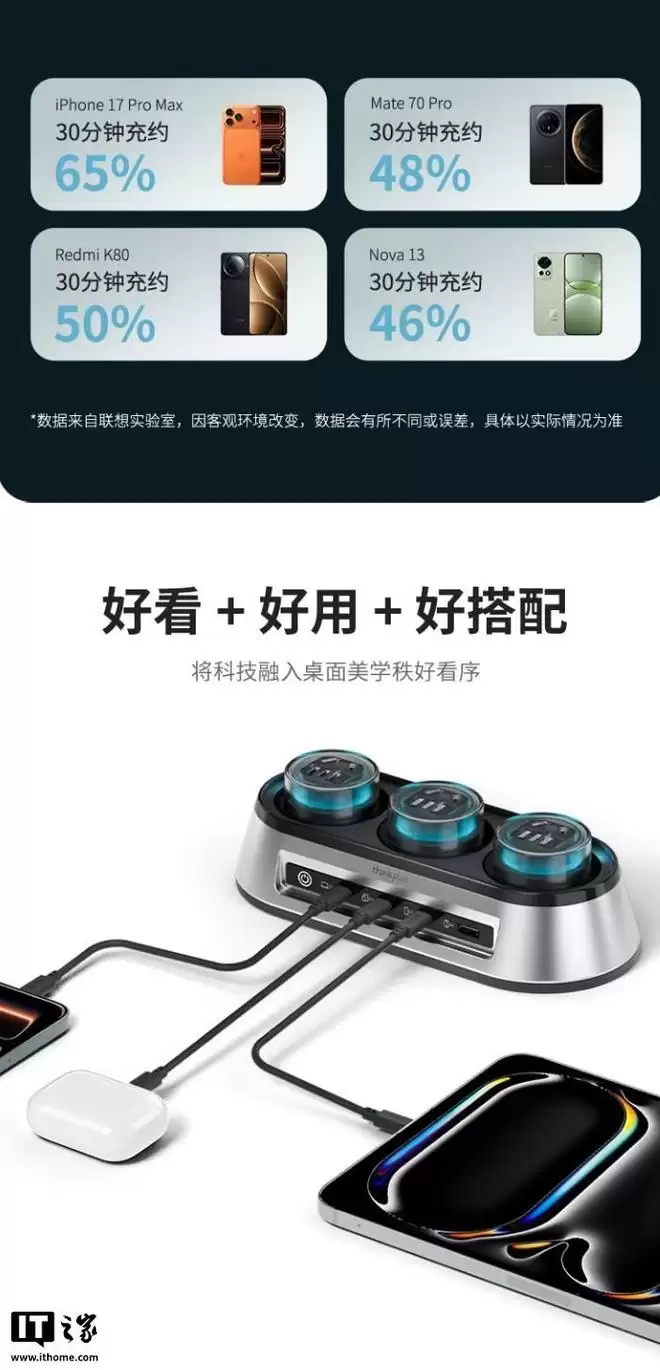 IT之家 1 月 6 日消息,联想 ThinkPlus 现已推出锋行者氮化镓 150W 桌面充电站,采用 3AC 电源插座 +3C+1A 的接口配置,兼容各大品牌的笔记本电脑,售价 599 元。