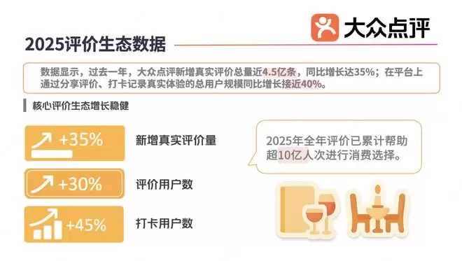 1月6日,大众点评发布“2025评价生态数据”。数据显示,过去一年,大众点评新增真实评价总量近4.5亿条,同比增长达35%;在平台上通过分享评价、打卡记录真实体验的总用户规模同比增长接近40%;其中,打卡用户数增速达45%,评价作者数增幅接近30%。