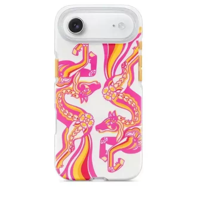 据介绍,这款保护壳以骏马的灵动感与生命力为灵感,采用粉色、红色、橙色和黄色的鲜明渐变设计,通过对剪纸艺术的现代演绎生动呈现。