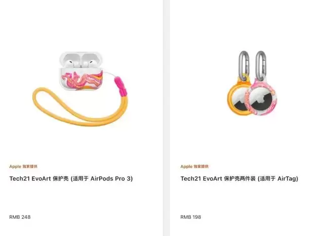苹果同时带来了248元的Tech21 EvoArt 保护壳(适用于 AirPods Pro 3/AirPods 4)、198元的Tech21 EvoArt 保护壳两件装 (适用于 AirTag)。